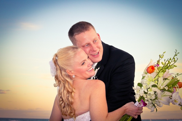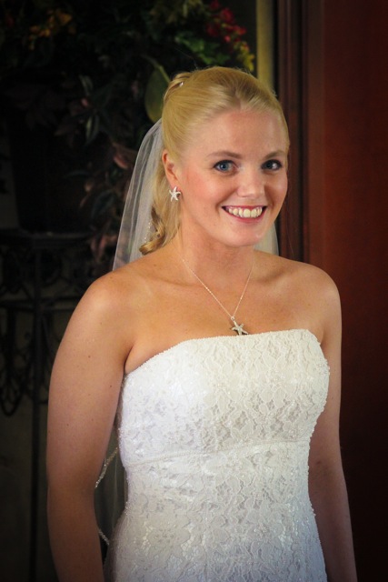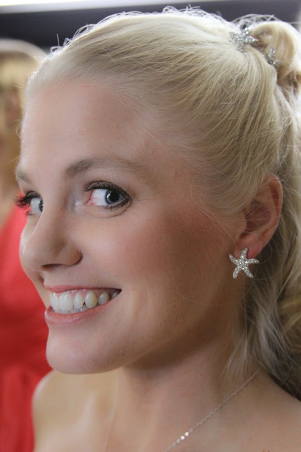 Bride Elaine opted for a Classic Beauty look for her November beach wedding. I began with prepping and priming her beautiful skin to create a workable canvas. I then applied airbrush foundation, blush and highlighter for a flawless finish. A soft peachy, pink blush accented her cheeks and I used an illuminating airbrush color on the high points of her face.